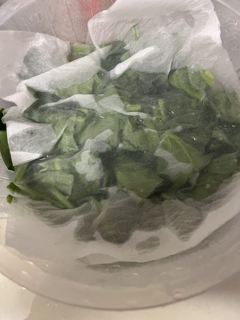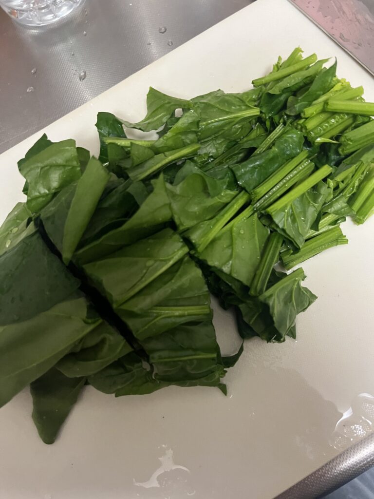 1.ほうれん草は、よく洗い4cm幅に切って水にさらす10分以上(あく抜き)