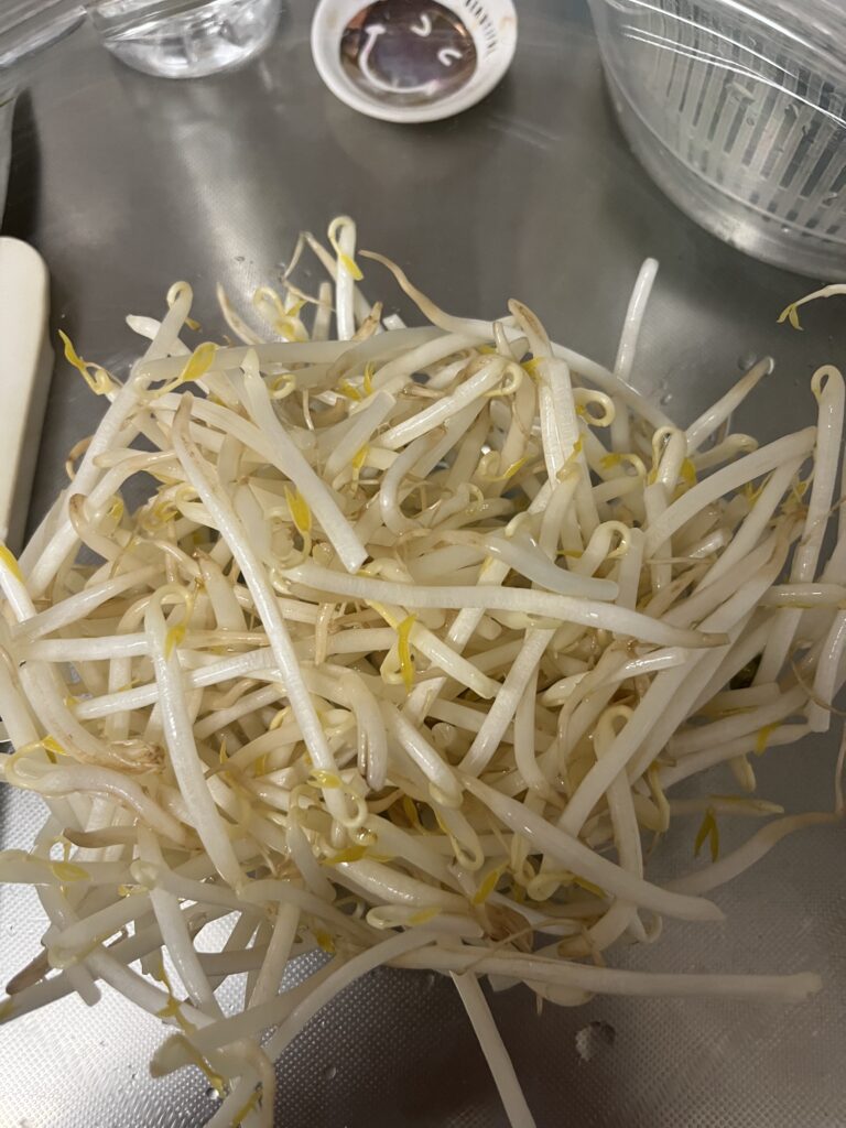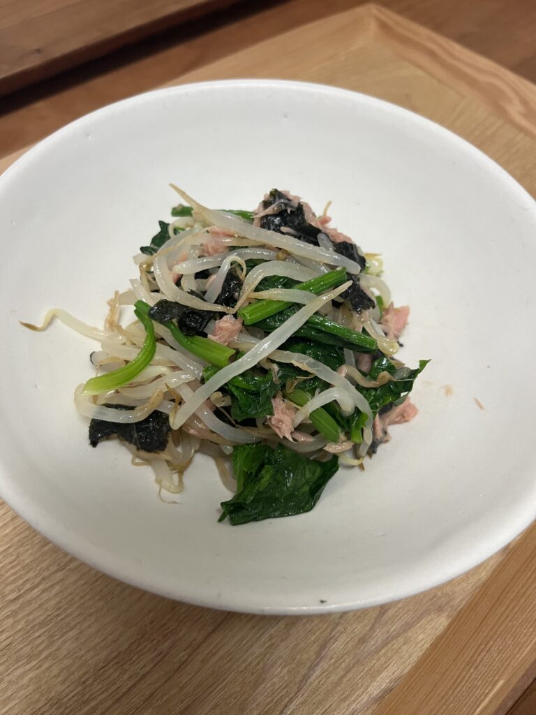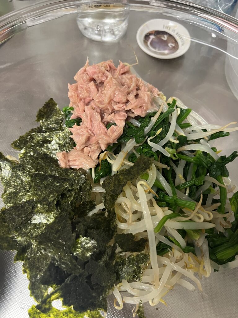 材料 ほうれん草 1袋 もやし1袋 ツナ缶1 焼きのり 2枚