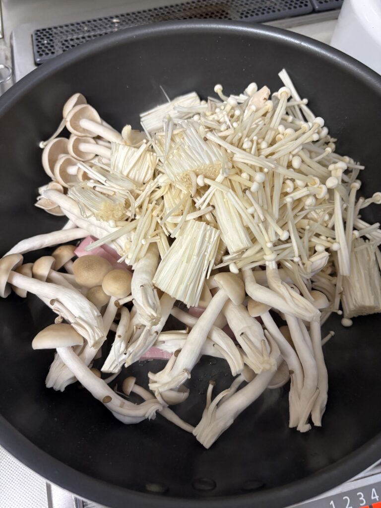 3 きのこがしんなりしたらBを入れとろみがつくまで火を通し完成。